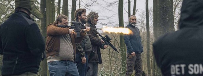 Mørket er tæt og dialogen helt sort i Anders Thomas Jensens Retfærdighedens ryttere. Filmen har først premiere 12. december, men blev præsenteret ved et arrangement på Det Danske Filminstitut i sidste uge.