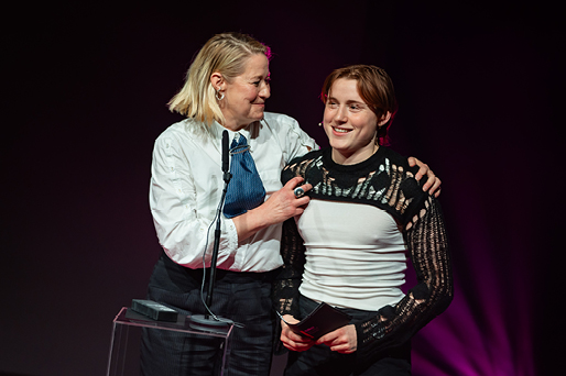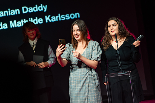 Instruktør Ida Mathilde Karlsson (th.) og klipper Anna Løvkvist tager glade imod prisen for den personlige dokumentar Iranian Daddy, hvor instruktøren leder efter sin far.