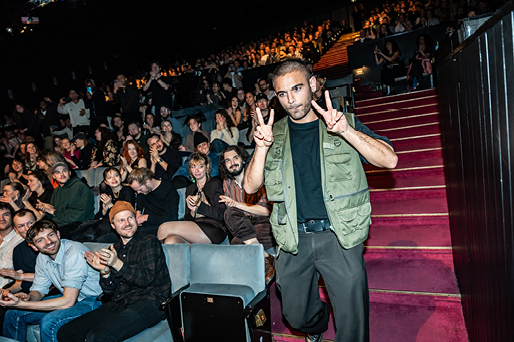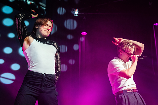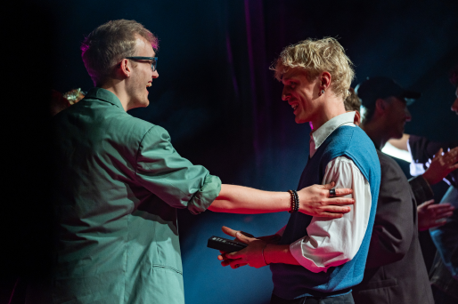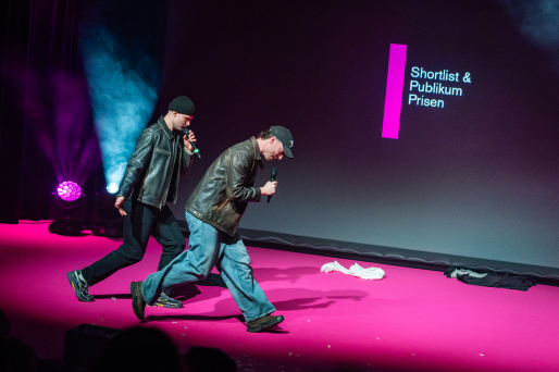 Sidste års værter Kristoffer Eriknauer og Lasse Dein får en stormende modtagelse, da de indtager scenen og giver prøver på gakkede dansetrin før uddelingen af Publikum Prisen.