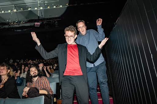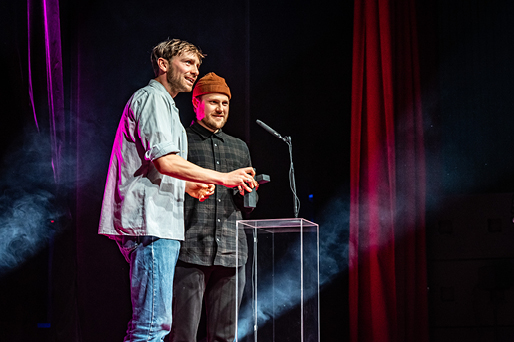 Skuespilleren Sebastian Sørensen og instruktøren Viktor Gelbek fejrer, at de har vundet Publikum Prisen med SoMe-komedien Krazykalle.