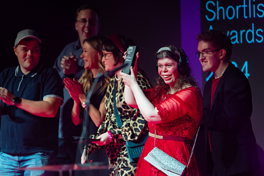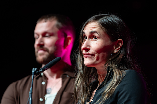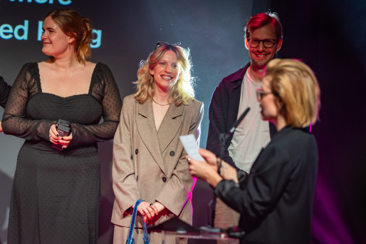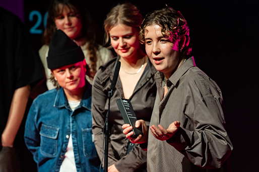 Skuespilleren Josephine Park læser juryens motivation op for Shortlist Prisen til Sammen er du mere, mens instruktøren William Sehested Høeg, hans søster Emma Sehested Høeg og produceren Sofie Vendelbo Bergstein er ét stort smil.
