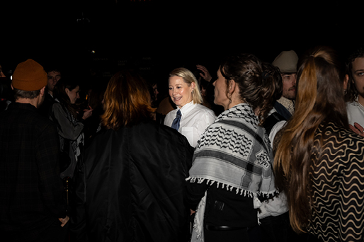 Man spotter Trine Dyrholm i mængden af glade filmfolk, der holder gang i efterfesten på Bremen Teater.