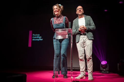 Komikeren Ditte Hansen og hendes mand Benjamin Boe Rasmussen, der er forperson for Dansk Skuespillerforbund, uddeler prisen for bedste mandlige skuespiller. Men først slår de et slag for det vigtige fagforeningsarbejde i filmbranchen.