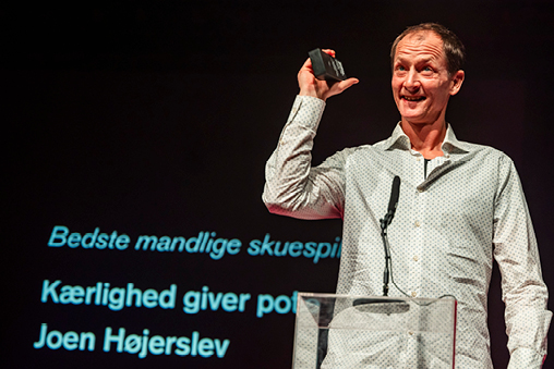 Joen Højerslev spiller over for en hund i den bedårende Kærlighed giver pote og takker sin instruktør Albert Morel. ”Hvis Albert spørger, skal I sige ja,” anbefaler han salens skuespillere og afslører, at det er hans første pris i karrieren.