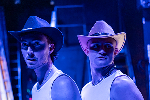 Lasse Dein og Kristoffer Eriknauer har taget deres bedste stripperkluns på, for nu skal anden halvdel af showet sparkes i gang.