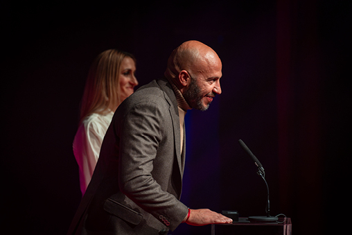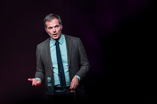 Mikael Bertelsen holder aftenens længste præsentationstale af Publikum Prisen. ”Publikum rager mig en høstblomst,” siger han og fortsætter med salen i sin hule hånd: ”Jeg har altid kun lyttet til én person, og det er mig selv.”