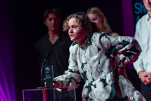 Signe Pallesen får overrakt prisen for bedste scenografi i den gribende Overtoner. Det er den erfarne scenograf Liselotte Justesen (Guldkysten), som overrækker statuetten.