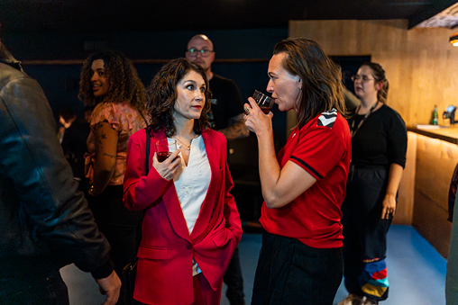 Skuespiller Mia Lyhne diskuterer aftenens begivenheder med vennen og grafikeren Mette Flink, som er iklædt den trøje, hun spillede i på Ekkos hedengangne fodboldhold.
