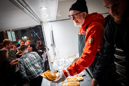 Zentropas stifter Peter Aalbæk Jensen langer for femte år i træk hotdogs over disken til de sultne festgæster efter showet. Sidste år stod provo-produceren med en Dansk Folkeparti-kasket, men i år er han iført Enhedslistens hue.