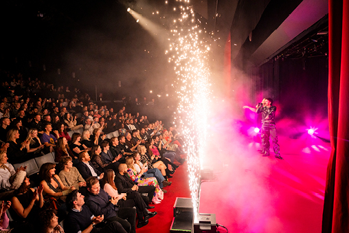 Værternes åbningsnummer afsluttes med lysgejser og stor begejstring i salen. Så er festen skudt i gang!
