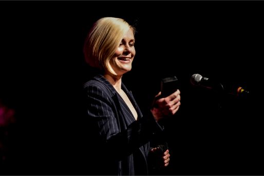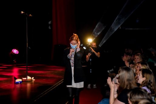 Marianne Lentz er idékvinde og manuskriptforfatter bag En flirt. Iført mundbind finder hun vej til scenen for at modtage prisen for det overbevisende manuskript om et seksuelt overgreb på en avisredaktion.