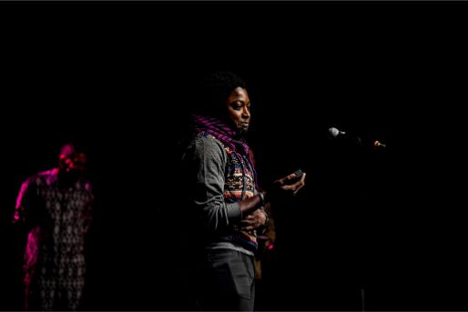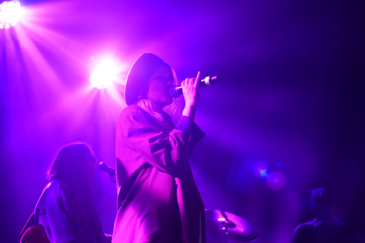 Mens publikum finder deres pladser, giver musikeren Soleima og hendes musikere den gas – indhyllet i lilla røg.
