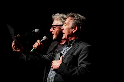 Dansk films morsomme makkerpar Wikke og Rasmussen indtager scenen for samstemmigt at overrække prisen for bedste animationsfilm til Hvor træerne blokerer for lyset.