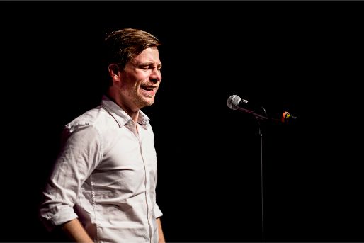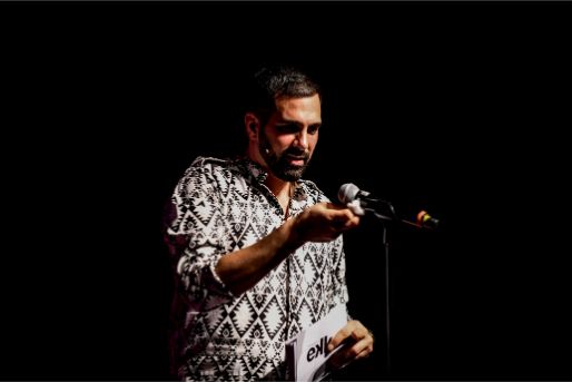 ”Sprit!” bliver der efter aftale råbt fra folk nede i salen, hvorefter værten Zaki Youssef løber op for at spritte mikrofonen af. Humor og hygiejne går hånd i hånd.