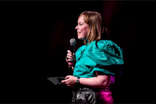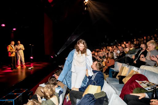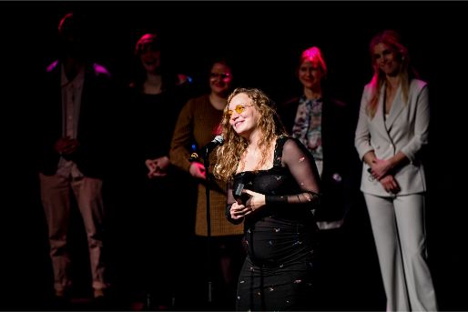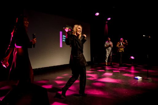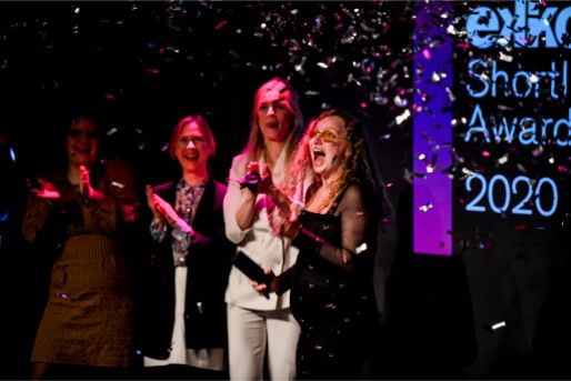 Showet kulminerer med konfetti og stormende bifald, da Zinnini Elkington og holdet bag En flirt vinder Shortlist Prisen og modtager en pengepræmie på 25.000 kroner.