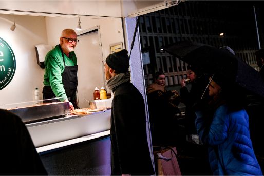 Oven på et festligt show møder der gæsterne en sidste overraskelse: Zentropa-produceren Peter Aalbæk Jensen står og serverer pølser i massevis ude foran Bremen Teater.