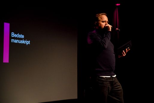 ”Hvis du er en dårlig forfatter, skal du bare blive filminstruktør,” siger en veloplagt Magnus Millang, inden han uddeler prisen for bedste manuskript.
