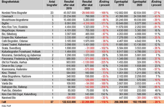 Samlet set er biograferne gået fra et overskud på 122,5 millioner kroner i 2019 til et underskud på 22,3 millioner kroner i 2020. Det er en tilbagegang på ikke mindre end 118 procent.