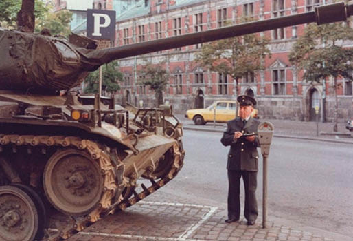 I Olsen-banden overgiver sig aldrig vender banden tilbage til Børsen, hvor Arthur Jensen som parkeringsvagt udskriver en bøde til deres kampvogn.