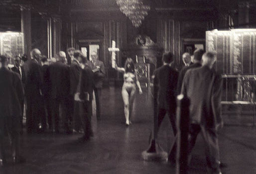 I efteråret 1969 fik de travle aktiehandlere sig noget af en overraskelse, da en nøgen kvinde trådte ind i bygningen med et kors højt hævet i hånden.
