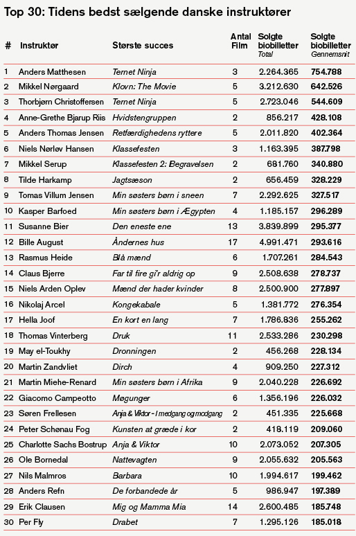 På ellevte- og tolvtepladsen ligger to af dansk film største navne – Susanne Bier og Bille August – med næsten samme gennemsnitlige billetsalg for henholdsvis tretten og sytten spillefilm (det sidste er rekorden for top 30-instruktører).