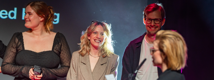 Produceren Sofie Vendelbo Bergstein, hovedrolleindehaveren Emma Sehested Høeg og instruktøren William Sehested Høeg får overrakt Shortlist Prisen for Sammen er du mere af skuespilleren og jurymedlemmet Josephine Park.