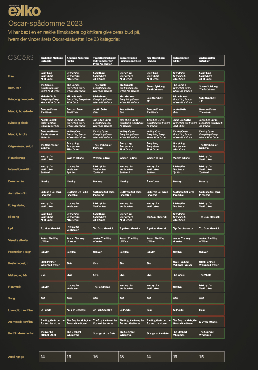 Således er eksperterne fra de amerikanske medier Variety, Deadline Hollywood og Awards Daily ikke i nærheden af at ramme lige så mange rigtige som Ann Lind Andersen, Maria Månson og Casper Hindse.