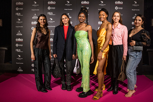 Kvinderne bag Olivia er trukket i festtøjet i aftenens anledning. Filmen handler om hverdagsracisme i Danmark og er en af Ekko Shortlist-brugernes absolutte favoritter. Fra venstre er det Aida Seyede, Caroline Plummer, instruktør Stine Likodelle, hovedrolleindehaver Diêm Camille G., producer Laura Plummer og Emina Nado.