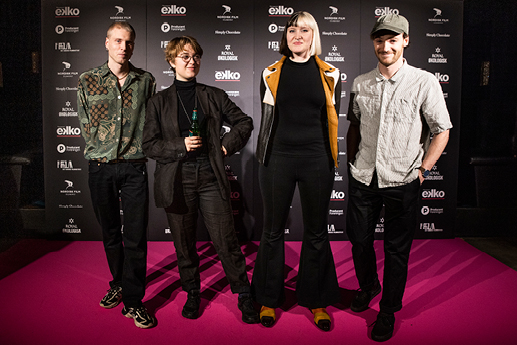 Med en øl i hånden poserer tidligere Ekko Shortlist-vinder Tone Ottilie sammen med holdet bag det sitrende ungdomsdrama Babylebbe.Emil Aagaard (tv.) er i spil for sin fotografering, og Tone Ottilie er nomineret for bedste fiktion, mens Arendse Løvind Andersen og Martin Anthon Sørensen ender med at vinde prisen for deres klipning.