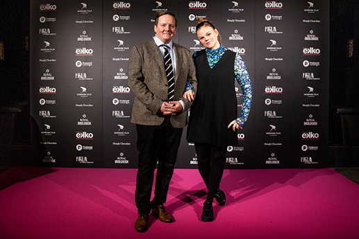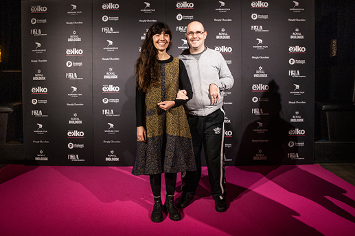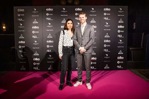 Filippa Suenson og hendes mand, skuespilleren Janus Elsig, sender store smil ud til kameraet. Suenson er nomineret for sin skuespilpræstation som psykisk udfordret mor i Uden at blinke.