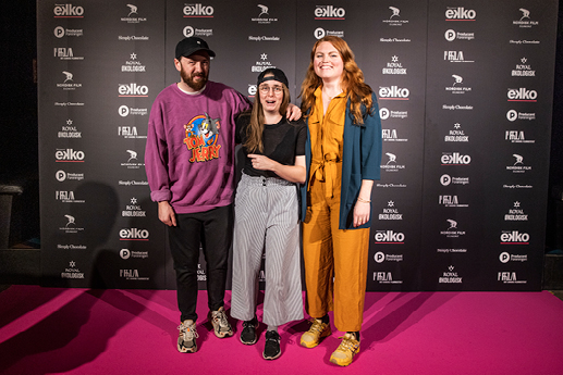 Instruktør Kasper Møller Rask virker afslappet i Tom & Jerry-sweater, selv om hans kortfilm November er nomineret til bedste fiktion, fotografering og klipning. Med sig har han Christina Bach (midt) og filmens producer Iben Søtang.