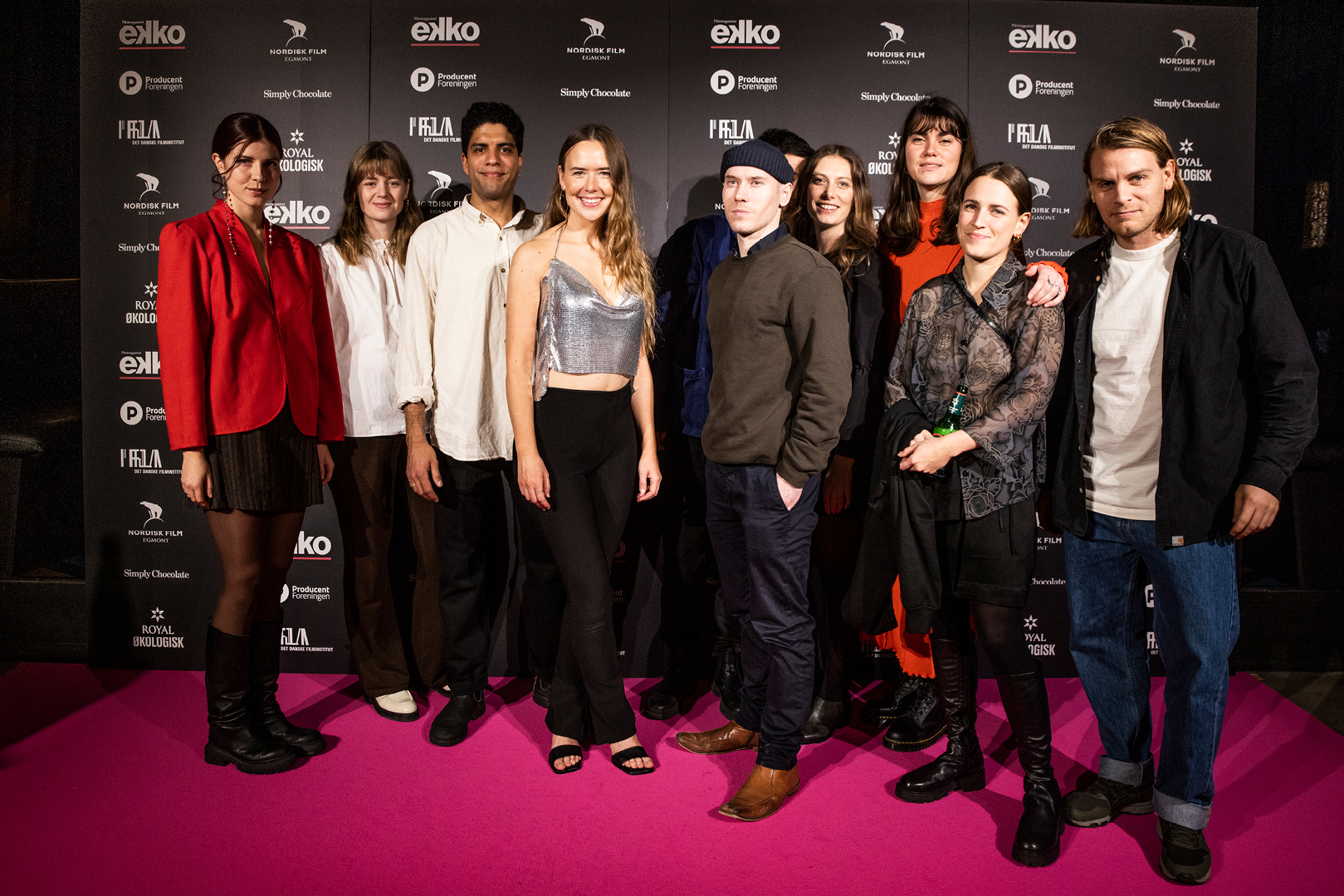 Holdet bag Filmskole-afgangsfilmen Frie mænd er mødt talstærkt op på den røde løber med instruktør Óskar Kristinn Vignisson i centrum med sort blazer. Fra venstre er han omgivet af Diana Queirós – som vandt for filmens lyddesign – Christian Karlsen, Juan Eduardo Becerra Bastias, Mie Sofie Nielsen, Søs Thøstesen, Anton Hjejle, Signe Borrevang, Martha Lieberath Mørk og Signe Krab Nymann.