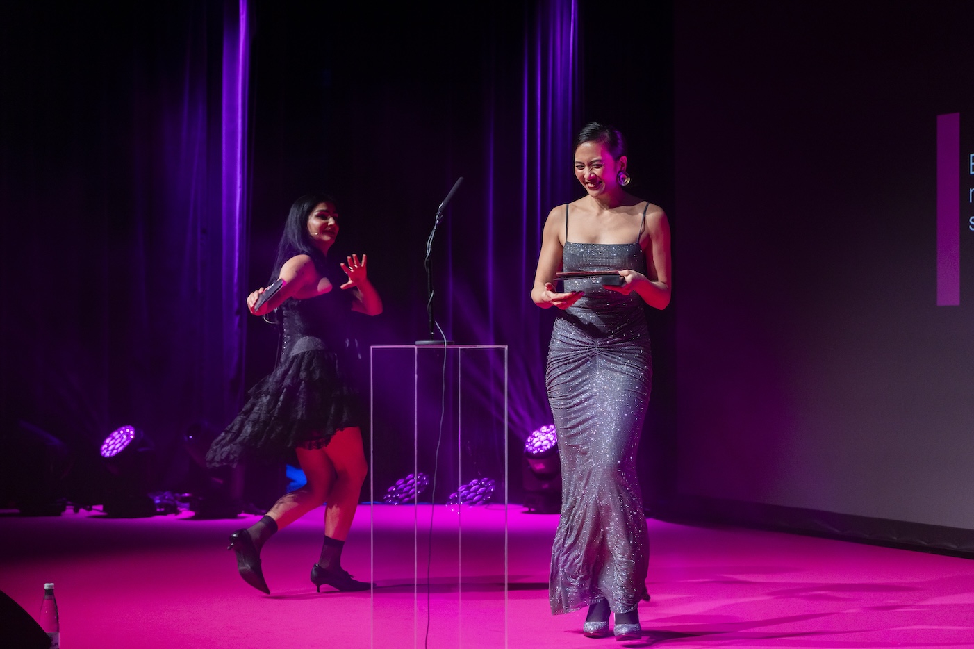 Helin Erdem når lige at lade sig imponere over Sandra Yi Sencindivers glamourøse kjole, inden skuespilleren og aktivisten på forrygende vis introducerer de nominerede til prisen for bedste mandlige skuespiller.
