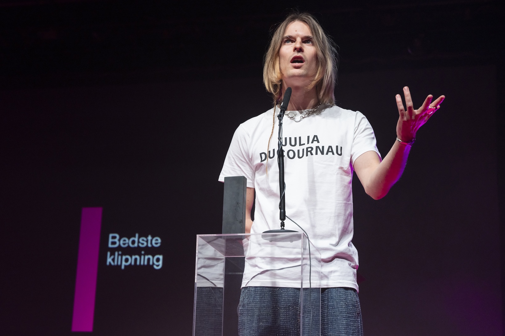 Den tidligere Guldpalmevinder Julia Ducournau (Titane) fik ikke mange roser for sin nye aids-film Alpha, men Sauna-instruktøren Mathias Broe er tydeligvis fan og viser det stolt, mens han præsenterer prisen for bedste klipning.