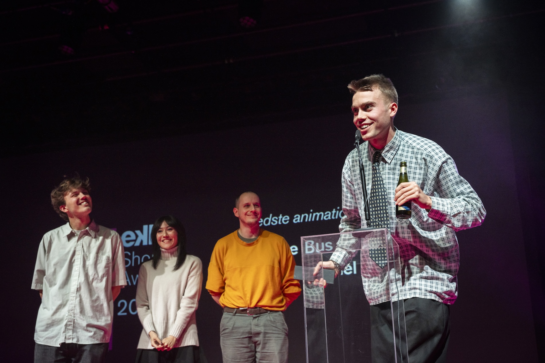 Med en øl i den ene hånd og prisen for bedste animation i den anden holder Elmer Lødemel tale sammen med holdet bag den mesterlige afgangsfilm fra The Animation Workshop: Service Bus.