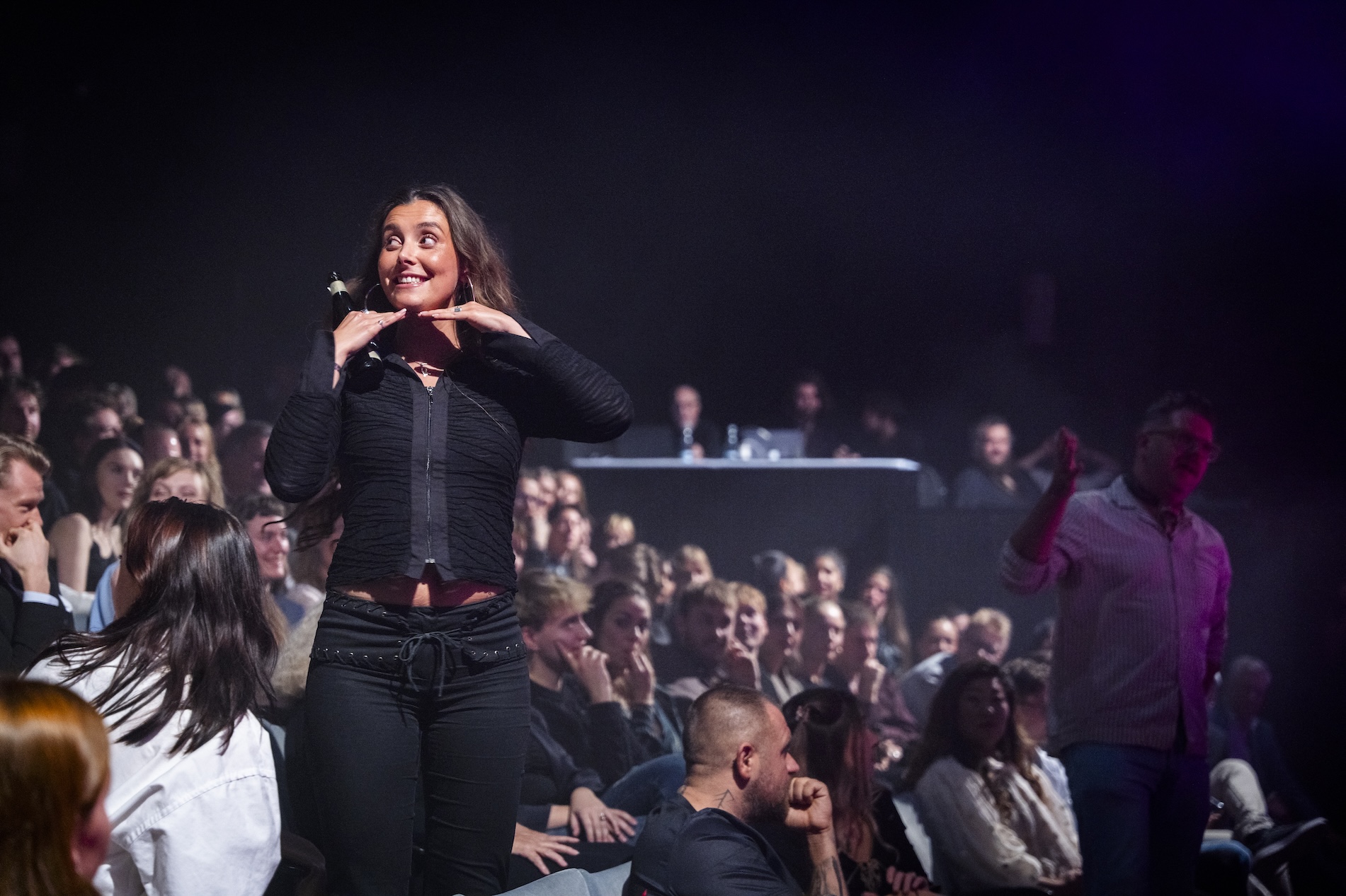 Udfordre din angst! Skam-stjernen Ulrikke Falch giver sig selv en omgang konfrontationsterapi ved at vise muskler til hele salen, inden hun uddeler prisen for bedste fotografering.