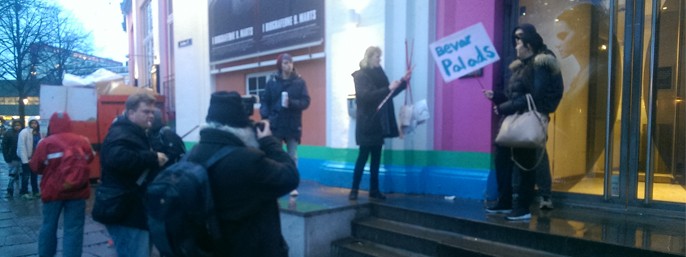 ”Bevar Palads,” står der tørt på et andet papskilt. Det bliver holdt af en anden ung pige med kasket og dynejakke.