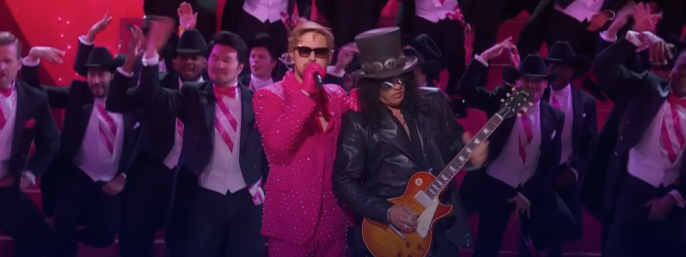 Skuespilleren Ryan Gosling hev guitarhelten Slash på scenen til sin Gentlemen Prefer Blondes-inspirede live-version af Barbie-sangen I'm Just Ken.