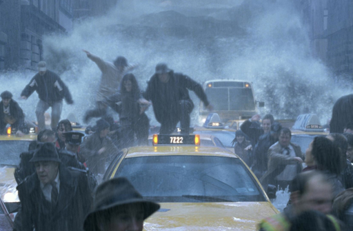 Menneskets store udledning af CO2 resulterer i en ny isvinter. Det bliver dog ikke værre, end at man kan løbe fra istiden, som Jake Gyllenhaal formår i The Day After Tomorrow (foto) i scenen. Han søger tilflugt på New York Public Library og når lige akkurat at smække døren i hovedet på den dræbende frost. Når isen med tiden så smelter, kommer vi alle sammen til at leve på vandet som i Kevin Reynolds’ Waterworld. Her bliver mennesket ført an af Kevin Costner, som har udviklet sexede fiskegæller. Det blev en af filmhistoriens største fiaskoer.
