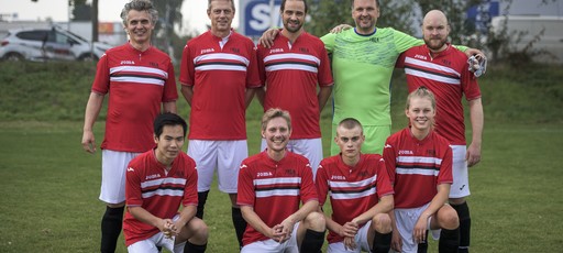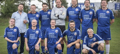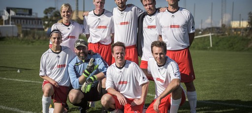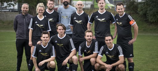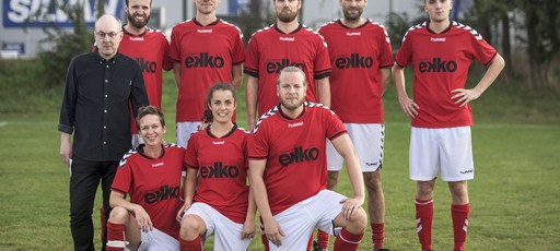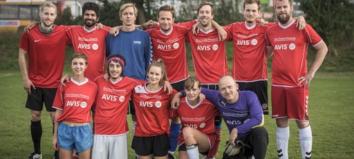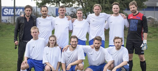 "Der er mange ting i livet, der er vigtigere end fodbold, men lige nu føles det ikke sådan!” Oliver Zahle (yderst th.) og Christian Potalivo i front kan ikke holde sig fra banen, da Miso Film banker Zentropa i semifinalen.
