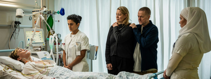 Trine Dyrholm og Anders Matthesens forældrepar står bestyrtede og ser til, mens deres søn ligger i koma efter en fejl begået af Özlem Saglanmaks læge (tv.).