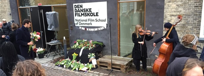 Ved dagens begravelse var alle inviteret til at komme og lægge en blomst under logoet ved Filmskolens hovedindgang på Holmen.