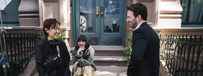 Celine Song (tv.) instruerer Dakota Johnson og Chris Evans i en af de mest romantiske scener i Materialists.