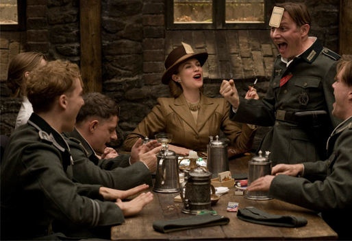 I kælderværtshuset bliver der skålet, festet og spillet kort. Her skulle undercover-spionen Bridget von Hammersmark (Diane Kruger) ellers mødes alene med englænderne, men lokalet er fyldt med tyskere, og snart må alle tale tysk. Englænderne lykkes med at opretholde tyske miner, selvom Archie Hicox’ (Michael Fassbender) særlige accent får filmpublikummet til at holde vejret.