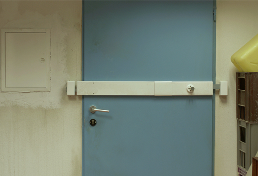 To døre ses. En mand åbner den ene, og halvdelen af lærredet bliver sort. ”Kom,” siger manden.