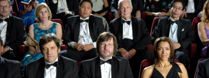I kortfilmen Occupations fra 2007 slår Lars von Trier (midt) en insisterende og forstyrrende filmanmelder ihjel, mens de sidder side om side i biografen. Så drastiske midler er næppe længere nødvendige – mediebranchen er godt i gang med selv at nedlægge anmeldererhvervet.