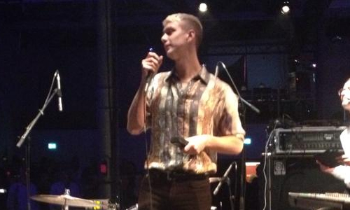 Nikolaj Nørlund er gået på scenen, hvor han står ene mand med sin guitar. Han spiller sange fra pladen Navnløs, hvor han fortolker Michael Strunge-digte.