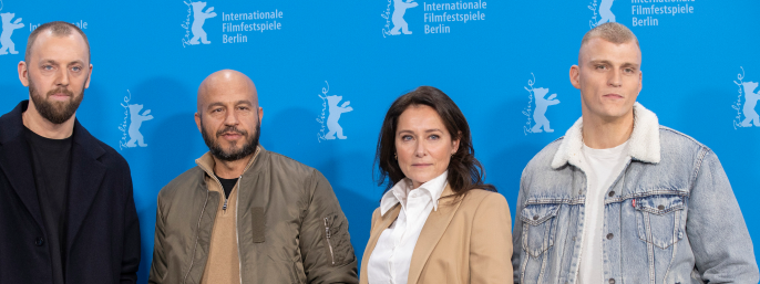 Instruktør Gustav Möller og skuespillerne Dar Salim, Sidse Babett Knudsen og Sebastian Bull poserer for fotograferne på Berlinalen, og ifølge Ekkos udsendte fortjener deres Vogter festivalens største hæder.
