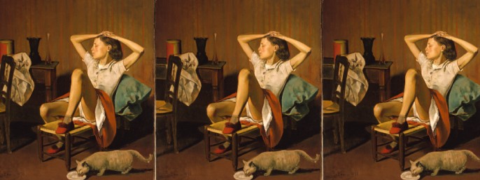 Der er tale om det berømte billede Thérèse Dreaming fra 1938. Pigen er fuldt påklædt og sidder alene med sin kat i en let drømmende stilling. Men det, der generer de selvbestaltede talskvinder for #MeToo-bevægelsen, er, at hun ikke sidder med tækkeligt samlede ben, som pæne piger gjorde på deres oldeforældres tid.