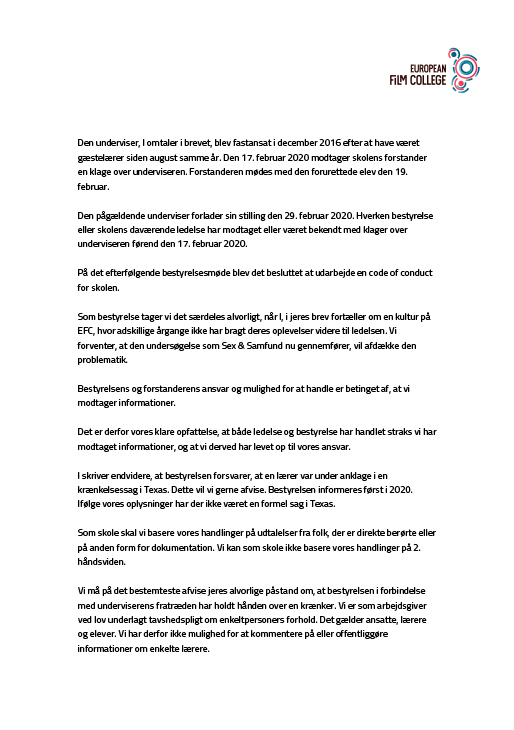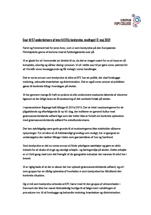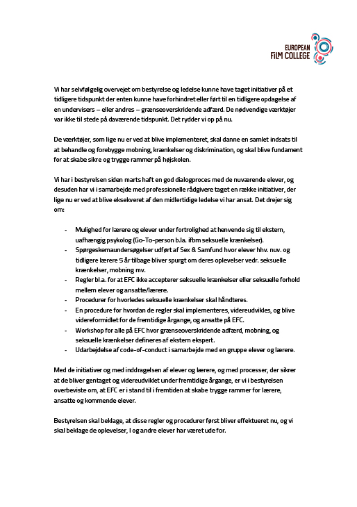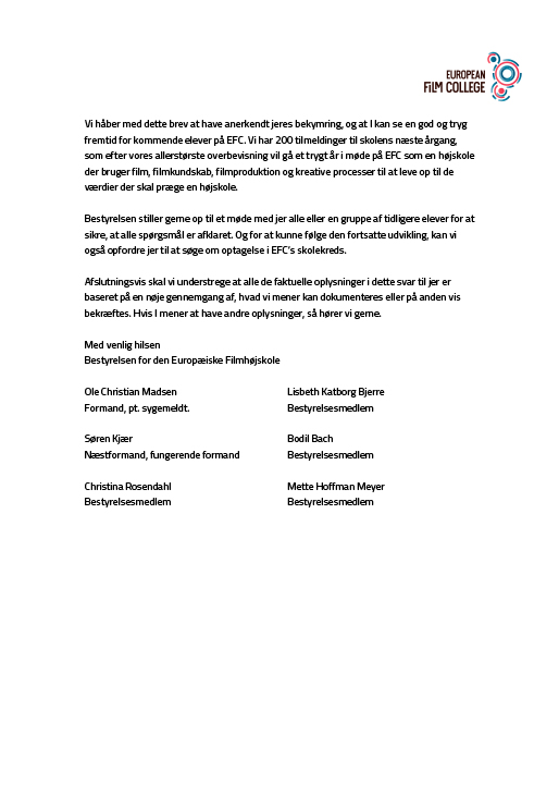 ”Vi må som bestyrelse erkende, at European Film College hører med til den gruppe af virksomheder i Danmark, der ikke har været tilstrækkelig hurtig til at følge med i udviklingen af procedurer med videre til at forebygge og behandle mobning, krænkelser og diskrimination.”